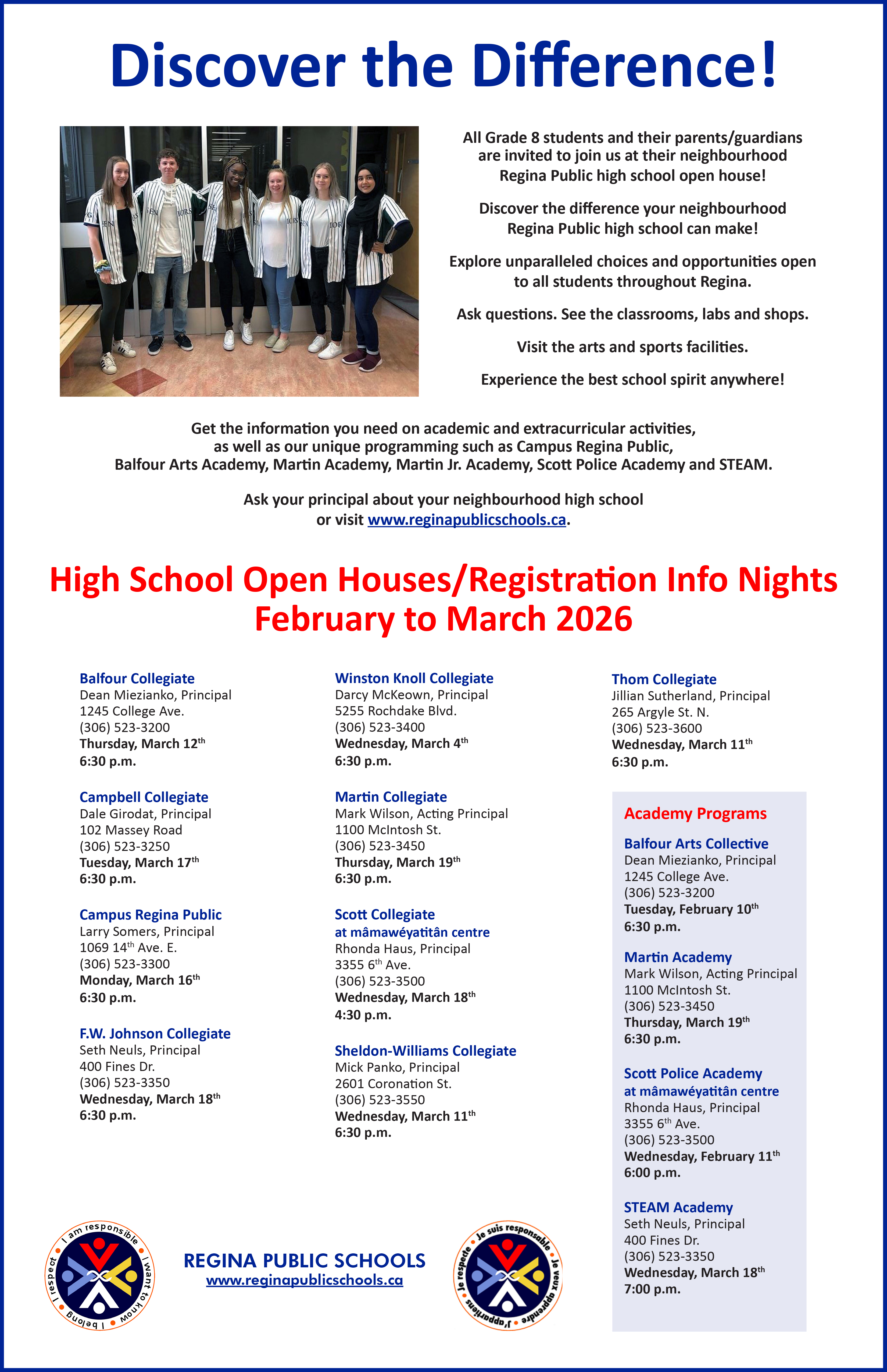 FEBRUARY 9, 2026—All Grade 8 students and their parents/caregivers are invited to join us at their neighbourhood Regina Public high school open house! Please see the ad below for specific high school dates and times.